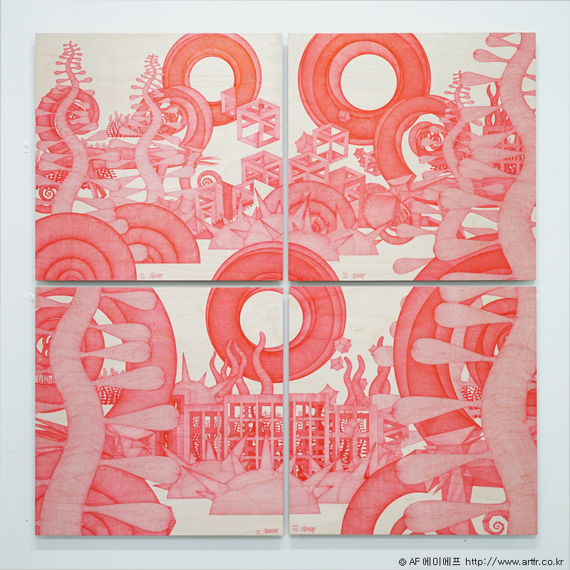 특히 《Anxious Dream》 연작은 강렬한 붉은색 배경 위에 시간의 흐름에 따라 끊임없이 변화하는 인간 감정의 연속성을 담아내며 시선을 사로잡는다. 마치 꿈속의 낯선 장면들처럼 이어지는 화면 속에서, 각각의 이미지들은 독립적인 심리적 순간들을 강렬하게 드러내며 불안이라는 감정의 다채로운 스펙트럼을 섬세하게 조형해낸다.
