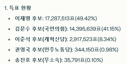 이번 선거는 1987년 직선제 개헌 이후 누적된 정치 구조의 한계를 드러내는 동시에 새로운 가능성을 예고했다. 79.4%의 투표율은 유권자들이 단순한 이념 대립을 넘어 정책 중심의 선택을 시작했음을 보여주며, 이재명 정부가 ‘문화 강국’ 비전을 실현하기 위해서는 정책의 구체성과 재정 기반 확보가 필수적이다. 21대 대통령의 성공 여부는 결국 국민의 기대를 정책으로 승화시키는 데서 결정될 것이다.