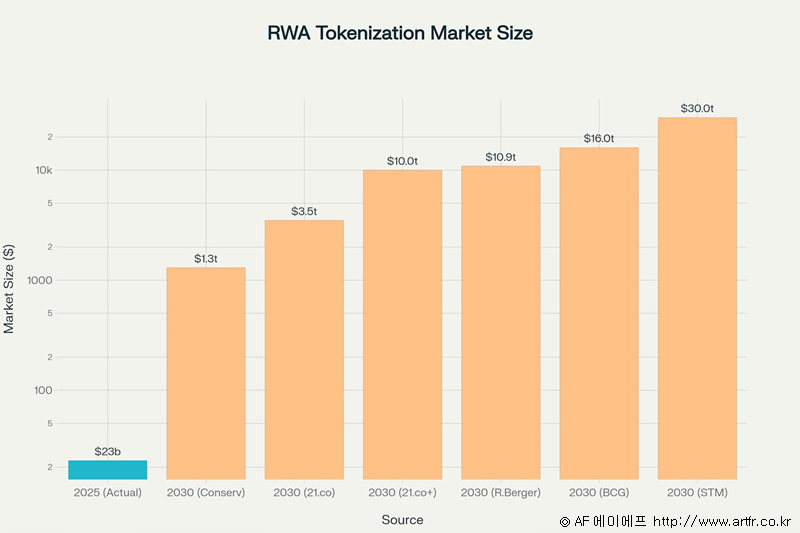 보스턴컨설팅그룹(Boston Consulting Group, BCG)과 싱가포르 금융청(Monetary Authority of Singapore, MAS)은 2030년까지 RWA 토큰화 시장이 4조에서 최대 16조 달러 규모에 이를 것으로 전망했습니다.(BCG 2024 보고서) Ripple(리플)과 BCG(2023)의 공동 보고서는 낙관적 전망으로 2033년까지 토큰화된 자산 시장이 18조 9천억 달러에 달할 것으로 예측했으며, 이는 연평균 성장률 53%에 해당합니다. 일부 분석가들은 낙관적 시나리오로 30조 달러까지 성장할 수 있다고 보지만, 이는 비공식 추정치로 분류됩니다.