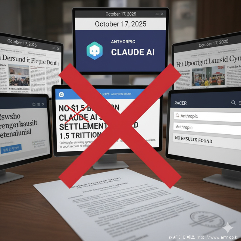 [AF 에엪 기술융합부] 인공지능(AI) 개발사 앤트로픽(Anthropic)의 챗봇 클로드(Claude)의 학습 데이터와 관련된 저작권 집단소송에서 거론된 ‘15억 달러(약 1조 5천억 원) 규모의 예비 합의안 제출’ 보도가 사실이 아닌 것으로 확인되었다. 로스앤젤레스 연방법원에 접수된 관련 소송 문서를 면밀히 검토했으나, 9월 말부터 10월 중순까지 앤트로픽이 이 규모의 예비 합의안을 법원에 제출했다는 공식적인 증거를 찾지 못했다. 법원의 전자공개시스템(PACER)과 주요 외신 매체의 보도, 그리고 앤트로픽의 공식 채널 어디에도 해당 합의안 제출 내역은 전혀 존재하지 않는다.