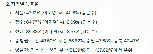 이재명 후보는 수도권에서 압도적인 지지를 받으며 승리의 초석을 다졌다. 서울 47.13%, 인천 51.67%, 경기 52.2%의 득표율은 도시 유권자들이 기후 위기 대응과 디지털 전환 정책을 중시했음을 시사한다. 반면 부산(51.39%)과 대구(67.62%)에서 김문수 후보가 우위를 차지한 것은 영남 지역의 보수적 성향이 여전히 유효함을 확인시켰다. 특히 광주와 전남에서는 각각 84.77%, 85.83%라는 압도적 지지가 이어졌는데, 이는 호남 정치판도가 단순한 지역 감정을 넘어 정책 기반 선택으로 진화했음을 보여주는 대목이다.
