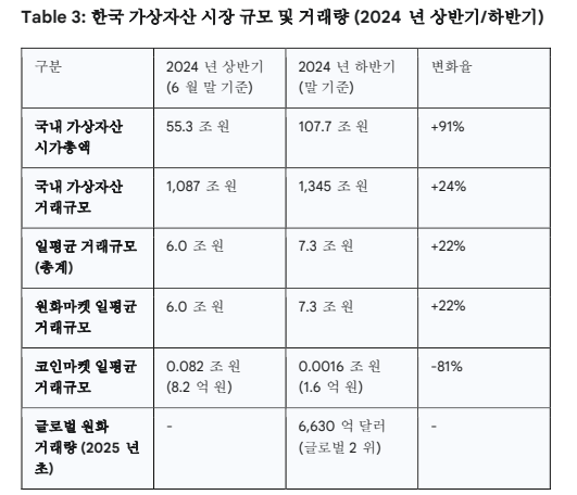 2025년 초부터 한국 원화로 거래된 금액은 놀랍게도 6,630억 달러에 달하여, 암호화폐 거래에서 미국 달러에 이어 두 번째로 많이 사용되는 법정 화폐로 자리 잡았다. 이는 한국이 글로벌 가상자산 시장에서 중요한 위치를 차지하고 있음을 보여준다. 전 세계 비트코인 거래량 중 원화 거래량은 18%에 달하며, 이는 일본 엔화(14%)와 유럽 유로화(7%)를 크게 앞서는 수치이다. 이러한 수치는 한국 시장이 글로벌 암호화폐 시장에서 차지하는 비중이 매우 크며, 특히 원화 기반의 거래 활동이 활발하다는 점을 강조한다. 이는 한국 시장의 독특한 특성과 투자자들의 높은 참여도를 반영한다.
