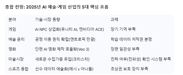 2025년 AI 예술·게임 산업은 기술이 실제 제품으로 나오는 속도 빨라짐, 법적인 틀이 구체화됨, 상업적 가치 증명, 새로운 창작 방식 확립, 그리고 여러 분야가 합쳐진 콘텐츠 시장 창출이라는 다섯 가지 주요 흐름으로 요약된다.