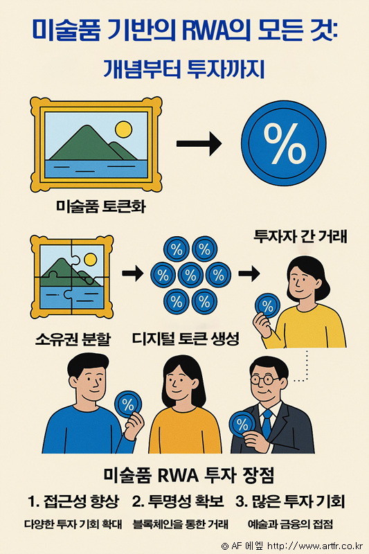 [AF 에엪 RWA부] 최근 투자와 예술 분야에서 ‘RWA(Real World Assets, 현실 자산)’라는 용어가 빠르게 확산되고 있습니다. RWA는 부동산, 금, 미술품처럼 실제 존재하는 자산을 블록체인 기술로 디지털화해, 누구나 쉽게 거래할 수 있도록 만든 새로운 패러다임입니다. 특히 미술품 RWA는 예술과 금융, 기술이 만나는 혁신의 현장으로, 고가의 명화 한 점을 여러 사람이 나누어 소유하는 ‘조각 투자’의 시대를 열고 있습니다.